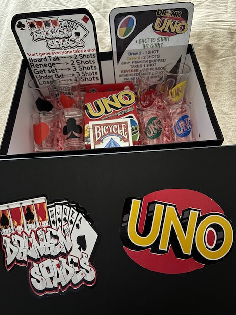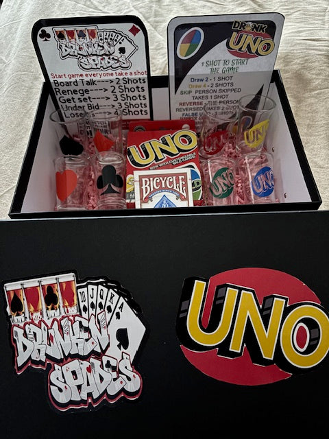 Turn game night into a wild ride with our Drunk Games: Shots Shots Shots set — the ultimate mashup of classic cards and party chaos. This custom black box is packed with everything you need to raise the stakes and the shot glasses.